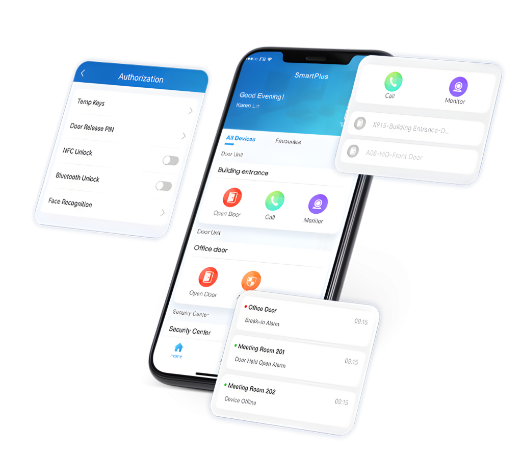 ● Conduct live video calls and remotely unlock doors
